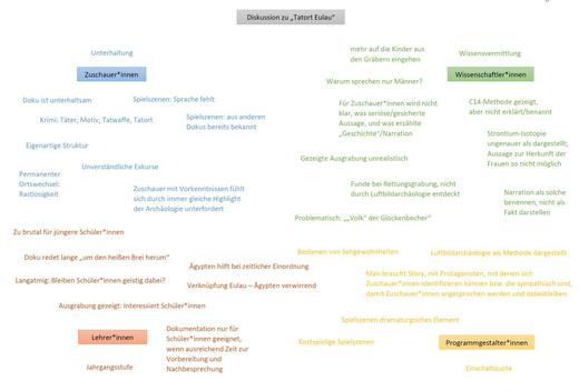 Wir nähern uns unterschiedlichen Beispielen auf unterschiedlichen Wegen: Einmal haben wir z.B. die Studierenden in 4 Gruppen eingeteilt: Sie sollten aus der Perspektive von Wissenschaftler*innen, Lehrer*innen, Programmgestalter*innen und Zuschauer*innen "Tatort Eulau" ansehen...