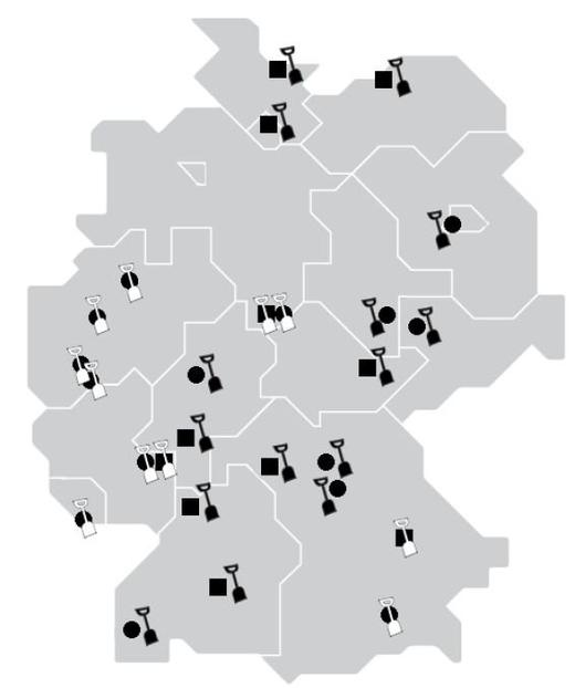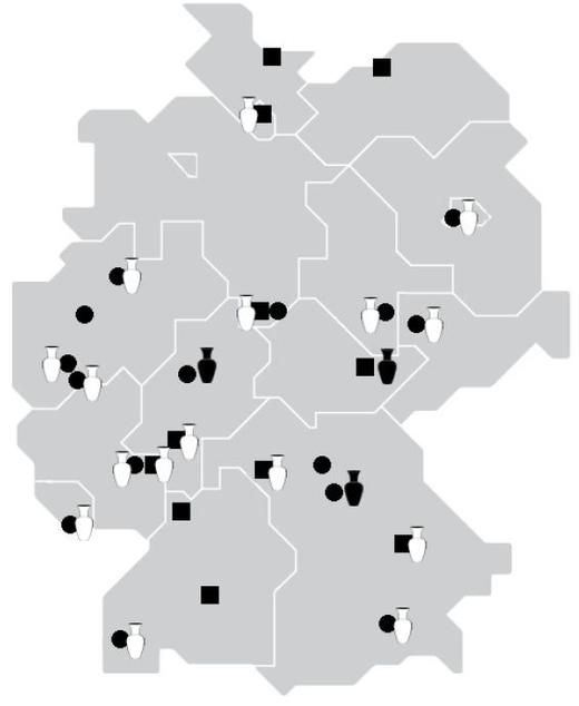 Eine Durchsicht der Studien- und Prüfungsordnungen von Bachelorstudiengängen der Prähistorischen Archäologie zeigt, dass Praktika im Bereich "Prospektion und Ausgrabung" in allen Studiengängen vorgesehen sind - teils verpflichtend, teils freiwillig (weiße Signaturen)